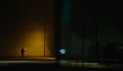 Det allersidste billede. Fra lang afstand ser vi skuespilleren Jan Gunnar gå rundt og snakke til sit kamera i et øde København om natten. Billedet er delt i to. Gaden er oplyst af et gult sodiumlys, og en grøn spejlingsflade i forgrunden dækker højre halvdel.