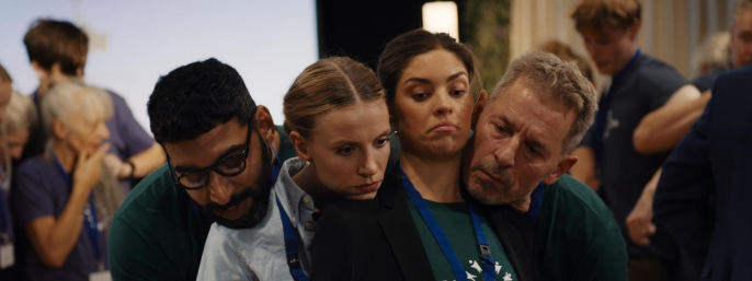 Dulfi Al-Jabouri, Emma Sehested Høeg, Natalie Madueno og Mikael Birkkjær øver sig i at være helt tætte på teambuilding-weekenden i William Sehested Høegs satire Sammen er vi mere.