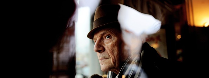 Jesper Christensen svinger benene ned fra bordet, læner sig ind over diktafonen, der stille ligger og summer på bordet, og siger så med en pludselig lalleglad stemme: