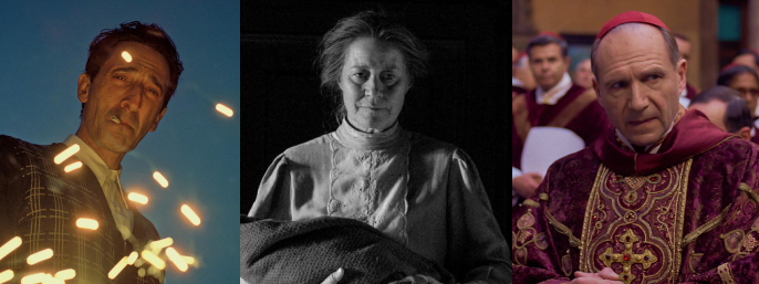 Arkitektdramaet The Brutalist med Adrien Brody (tv.) og kardinalfilmen Konklave med Ralph Fiennes (th.) er favoritter til prisen for bedste film, mens Trine Dyrholm og Pigen med nålen kan gå hen at blive Oscar-nomineret for bedste internationale film.