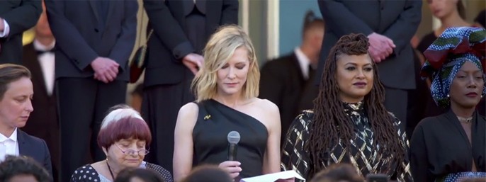 Der var 82 kvinder på trappen, fordi det er samme antal kvindelige instruktører, der har betrådt trappen for at vise en film i festivalens hovedbiograf siden starten i 1942, forklarede Cate Blanchett. Til sammenligning er tallet for mandlige instruktører 1.866.
