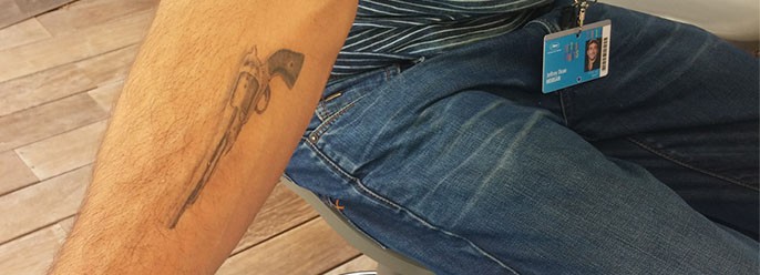 Jeffrey Dean Morgan har simpelthen en seksløber tatoveret på sin højre arm. Den er identisk med den Remington, han uden nåde dræber løs med i den danske western!