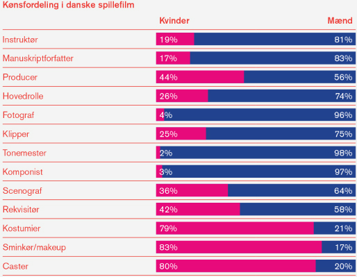 Af de mest fremtrædende roller på et filmhold er kun producerposten nogenlunde ligeligt fordelt med 56 % mænd og 44 % kvinder.