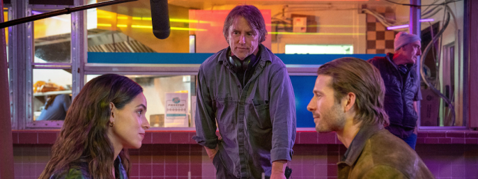 Richard Linklater (midt) instruerer Adria Arjona og Glen Powell i Hit Man, hvor en falsk lejemorder indleder en hed affære med en kvinde, han har narret.