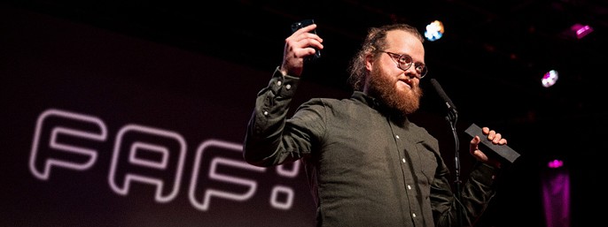 Tonemestrene Roar Skau Olsen og Johannes Rose fra bestyrelsen i FAF overrakte prisen for bedste lyddesign til Kevin Bavnhøj for Det ottende sakramente.
