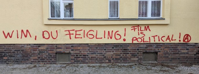 ”Wim, din kujon! Film er politisk,” står der skrevet på en husmur foran Kino Babylon i Berlin Mitte. Det er et svar på juryformand Wim Wenders’ udmelding om, at filmkunsten ikke er politisk.