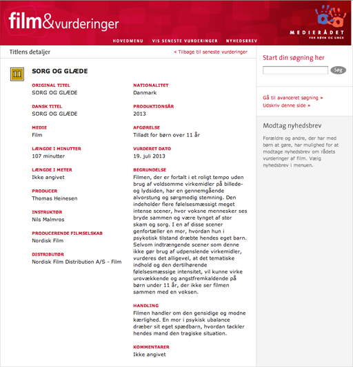 Efter offentliggørelsen af artiklen fjernede Medierådet for Børn og Unge fredag 19. juli vurderingen af Sorg og glæde fra sin hjemmeside på grund af en enkelt fejl i beskrivelsen, oplyser filmkoordinator Stine Nørgaard. Den nye beskrivelse blev lagt på nettet mandag 22. juli og kan læses herunder.