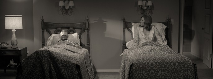 Handler om superheltene Wanda og Vision, der spilles af Elizabeth Olsen og Paul Bettany,