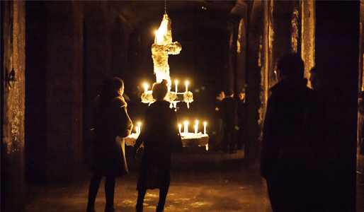 En ekstra mur indrammer rummet i gotiske buer, så lyset fra de enorme lysekroner falder overraskende i Rasmus Videbæks billeder. Lysekronerne er stærkt inspireret af et bestemt stykke kunst.