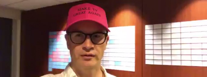 Og Nicolas Winding Refn gør det med stil og et glimt i øjet. Han er nemlig iført en rød kasket med en tydelig reference til den amerikanske præsident Donald Trump: ”Make TV Great Again.”