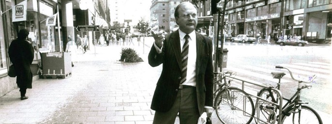 Grafikeren Stig Engström var mere end villig til at tale med politiet. Her poserer han med sit faste kendetegn – den sorte håndtaske – som han også bar den aften, da Palme blev myrdet (foto: Sveriges Politi).