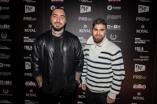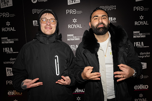 Joey Moe (tv.) er både succesfuld popmusiker med flere hits bag sig og nyuddannet filminstruktør fra Super8 i Aarhus. Til prisfesten uddelte han prisen for bedste originale musik, og sammen med en ven strålede han på den røde løber.