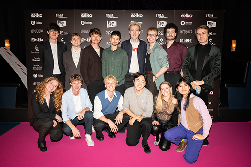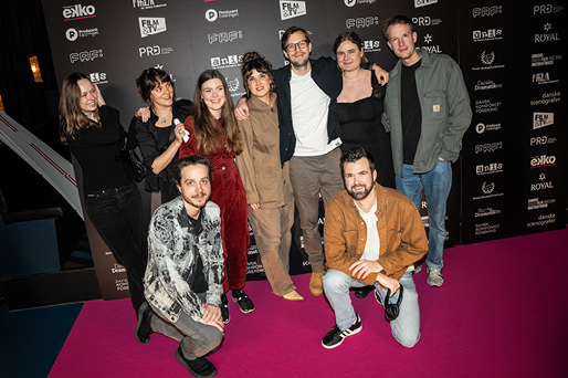 Den vilde komedie KrazyKalle løb med Publikum Prisen, og instruktøren Viktor Gelbek (knælende, nummer tre fra venstre) troppede op sammen med hovedrolleindehaverne Sebastian Munck Rasmussen (bagerst, nr. fire fra højre) og Sebastian Sørensen (bagerst, nr. tre fra højre) og resten af det store hold.