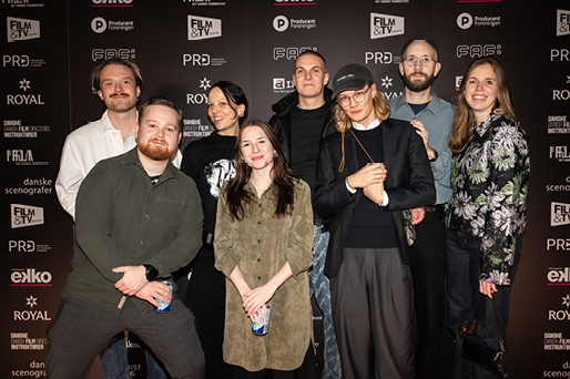 Hele fem fra holdet bag det unikke provinsdrama Nationen af Thomas Elley (nr. to fra højre) var nomineret ved Ekko Shortlist Awards. Heriblandt hovedrolleindehaveren Jonas Smedegaard (i midten), klipperen Maria Winther Juma (forrest i midten) og production designeren Emma Jacobsen (bagerst tv.)