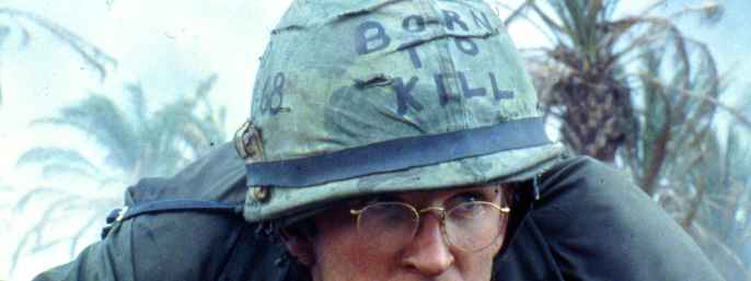 Matthew Modine spiller soldaten Pvt. Joker, der bærer en hjem med teksten ”Born To Kill” i krigsfilmen Full Metal Jacket.