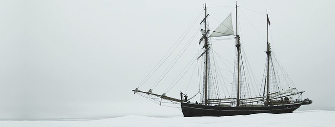 Noget, der minder om et sørøverskib, glider gennem det grønlandske landskab med master og sejl indpakket i antarktisk tåge.