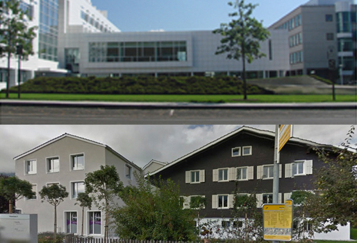 Den flotte, hvide bygning (øverst) er ifølge reklamen hovedsædet for Vanity X i Schweiz, men i virkeligheden leder adressen til en noget mindre glamourøs villavej (nederst).