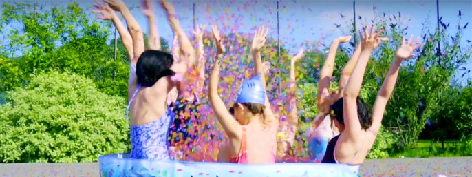 Blomster springer ud, tøjdyr brænder, og i slowmotion ses pigerne lege med kulørte bolde i et lille badebassin.