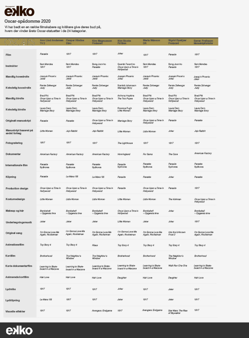 ”1917 er favorit, men jeg stemmer med hjertet og tror på, at Parasite kan overraske og skabe historie og den fornyelse, Akademiet så gerne vil have. Jeg håber!” skriver eksperten til Filmmagasinet Ekko.