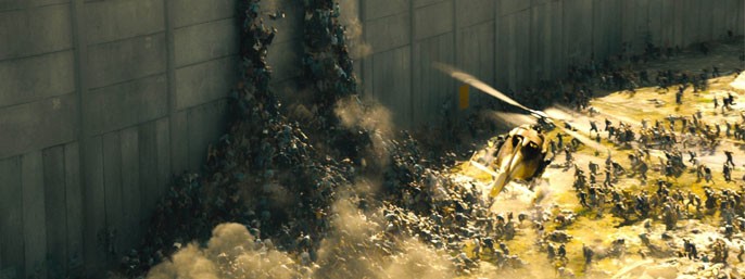 Anderledes hurtige er zombierne i katastrofefilmen World War Z (2013), hvor de levende døde kan løbe folk ned og vælter i bunker over husmurene.