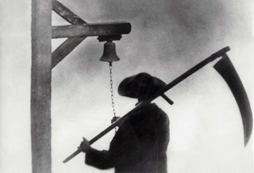 Her optræder en gammel mand med en le, der ringer en klokke, men det gamle billede viser ham kun fra ryggen. I det nye, taget af Casper Sejersen, kan vi derimod genkende von Triers ansigt stikke hovedet frem og antyde inspirationen.