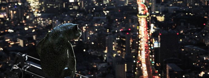 ”Idéen til, hvordan Dreaming Murakami skulle være, opstod, da jeg drømte om en kæmpe frø, som sidder og kigger ud over skyskraberne i Tokyo. Jeg stod op og skrev femten beats til en mulig udvikling af historien. Det blev mit kompas til filmen, og frøen har vi animeret ind undervejs,” siger Anjaan og drejer væk fra skiltet, der viser hen imod H.C. Andersens grav.