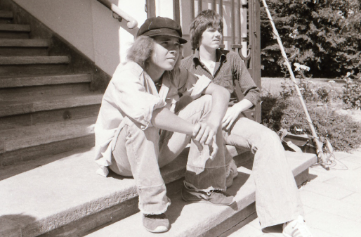 To af de medvirkende drenge sidder og nyder solen i en pause under optagelserne af Du er ikke alene fra 1978 (foto: Steen Herdel Filmproduktion).