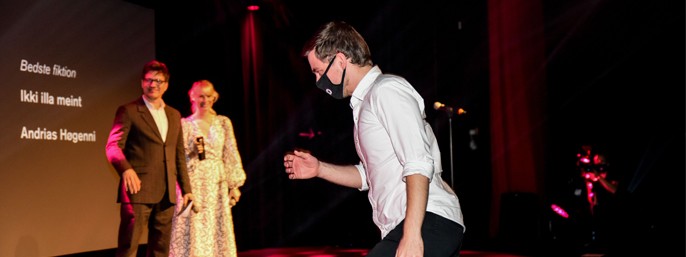 ”Det er fantastisk, så tak for en fantastisk aften. Og tak til Super16,” fortsatte instruktøren og slog over i en taksigelse på færøsk, før han sluttede af med et ”Yes!” og i ren glæde sprang ned fra scenen i stedet for at tage den omstændelige tur ned ad trappen.