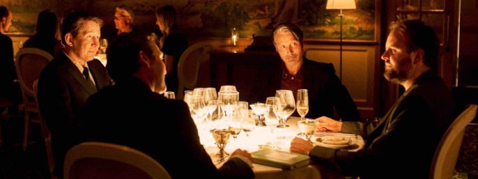 Mads Mikkelsen, Thomas Bo Larsen, Lars Ranthe og Magnus Millang sidder rundt om et bord.