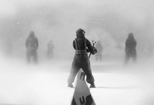 En lille flok arbejdere lavet af filt flækker tykke lag is. De bevæger sig alle ens, mens de producerer massevis af de store isblokke. Det hele gentager sig, gang på gang.