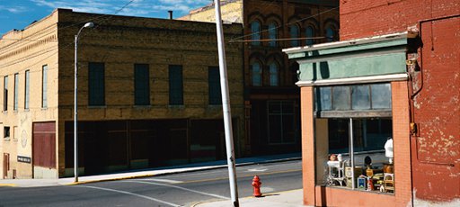 Men også landskaber og urbane scenerier, hvor mennesker har sat deres aftryk, interesserer fotografen Wenders. Spøgelsesbyer, affolkede gader, tomme huse eller halvrustne skilte, der hænger og knager i deres hængsler, mens de fortæller om de mennesker, som engang kom forbi og nu er draget videre.