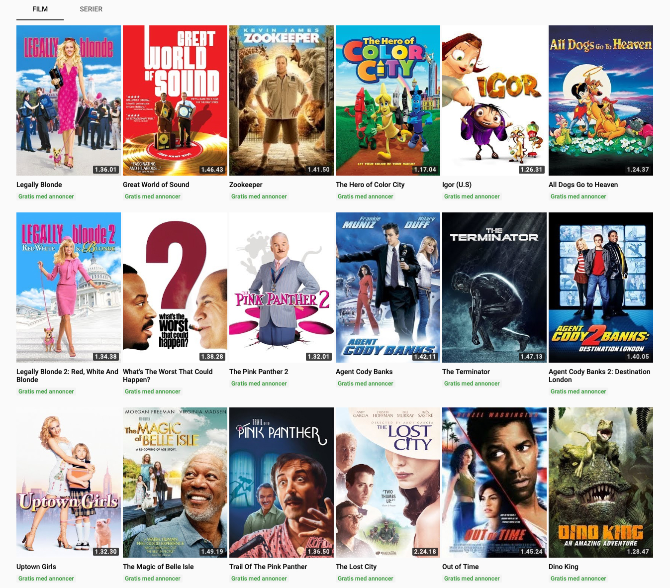 Filmene tæller lige nu titler som The Terminator, Legally Blonde og Pink Panther-filmene, de fleste Rocky-film og indtil videre omkring 100 andre titler. YouTube har ikke åbnet for deres gratis reklamefinansierede spillefilm uden for USA, så her fra Danmark skal man bruge en lille finte med VPN- eller DNS-omstilling. Hvis man vil prøve selv, kan man google sig frem til finten, der omgår såkaldt geoblokering – og det er ikke ulovligt!