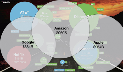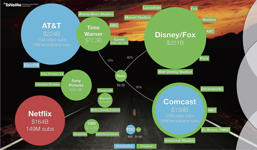 Men danske medieforbrugere står over for de amerikanske giganter, der alle har en aggressiv, global strategi og vil gå ind på alle markeder med attraktive streamingtjenester, som vil blive en hård konkurrent for de lokale spillere. Og vi taler altså om giganter, der er så store, at det kan være svært at se for sig.