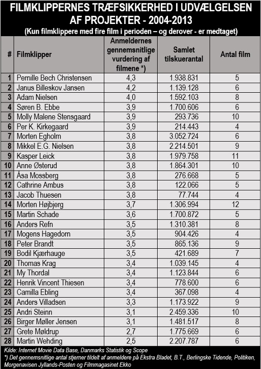 Bemærkelsesværdigt er det da, at for eksempel Jacob Thuesen med sikker hånd undgår film, der bare tilnærmelsesvis ligner publikumssuccesser. Det samme kan siges om enkelte klippere, der øjensynligt altid ender op med at arbejde med film af sørgelig kvalitet.