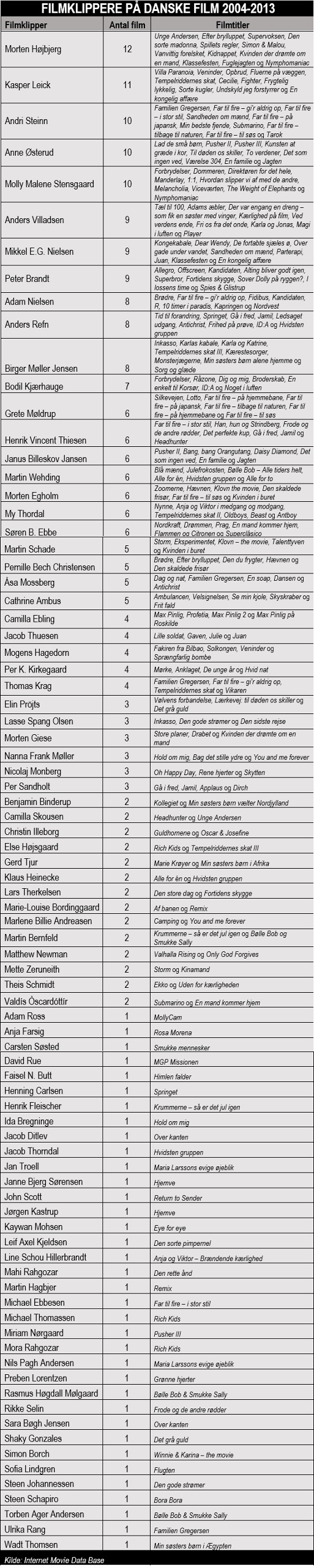 De 214 danske live action-spillefilm, der er produceret i perioden 2004-2013, har 86 filmklippere haft fingene i. På 24,8 % af filmene står flere personer krediteret som filmklipper.