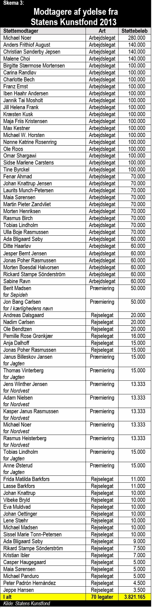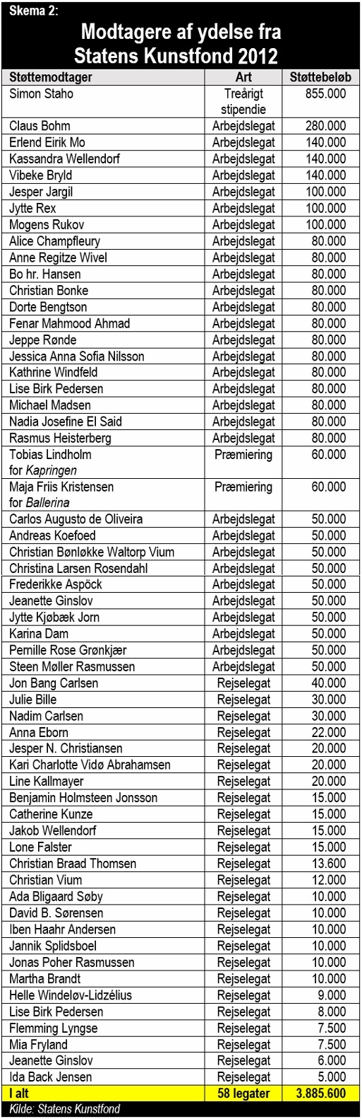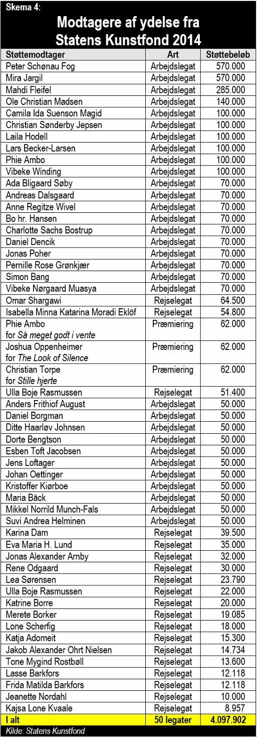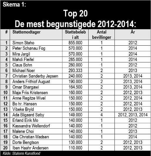 I skema 1 nedenstående er top 20 over de mest begunstigede gennem de seneste tre år. I skema 2, 3 og 4 nedenfor er modtagerne af ydelser fra Statens Kunstfond i henholdsvis 2012, 2013 og 2014.
