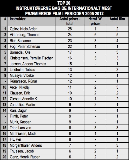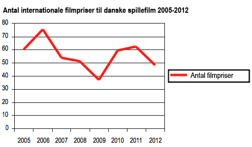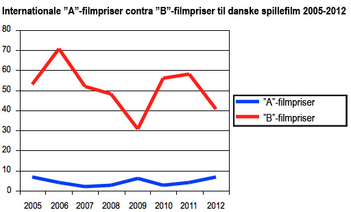 Men fokuserer man på filmpriser fra de prestigefyldte ”A”-filmfestivaler, som f.eks. Cannes, Berlin og Sundance, samt de mest betydningsfulde prisuddelinger, som Oscar og Golden Globe, tegner der sig et lidt andet billede: Her hjemtager dansk film kun mellem to og syv pr. år.