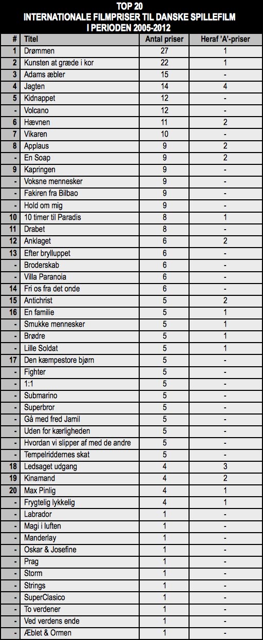I nedenstående skema kan den totale internationale prisregn over dansk film iagttages år for år i perioden 2005-2012.