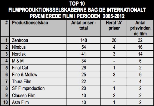 Og tesen bliver kun understreget yderligere, når man ser ned over listen af filmproduktionsselskaber bag de internationalt præmierede film i perioden 2005-2012.