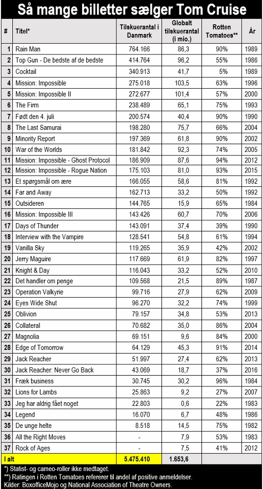 5,5 millioner danske publikummer har oplevet stjernen på det store lærred, heraf over en million tilskuere til Mission: Impossible-filmene. Hans største triumf på vores breddegrader er dog Rain Man fra 1989, selv om det måske nok er Dustin Hoffman, som skal have æren for den films gigantiske succes i Danmark. Under alle omstændigheder var samspillet mellem Cruise og Hoffman ren filmmagi.