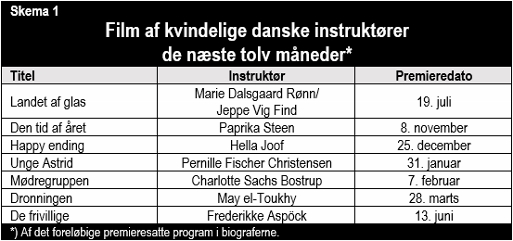 Et helt andet kapitel er kvindelige skuespillere, og her står kvindelige karakterer i allerførste række i de næste tolv måneder. Det gælder ikke mindst biografiske film om kvinder (skema 2).