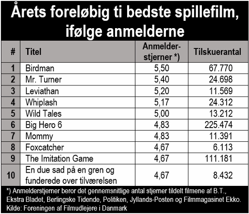 Der er dog en bekymrende udvikling. Det forekommer nemlig, at biografpublikummet ikke gider de gode film. Det er meget, meget trist, ikke mindst for dem selv. Ingen af ovenstående film vil være at finde på top ti over de mest sete film, når året er omme. Selv den mest succesfulde film på ovenstående liste, lader til at lide under at være god. Den ikke specielt vellykkede Hjem er i Danmark blevet set af flere publikummer, end den fremragende Big Hero 6.