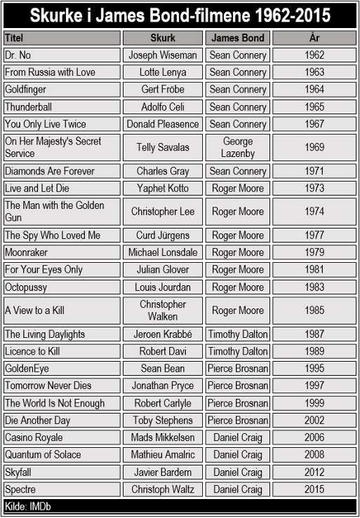 Listen af ikoniske Bond-skurke er lang: Ernst Stavro Blofeld er selvfølgelig selvskreven, men andre – såsom Rosa Klebb, Auric Goldfinger, Largo, Mr. Big, Scaramanga, Hugo Drax, Max Zorin og Le Chiffre – har skrevet sig ind i historiebøgerne.