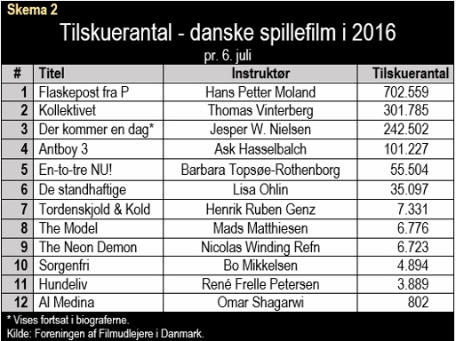 Se skema 2 nedenstående med komplet tilskuerantal til danske spillefilm pr. 6. juli.