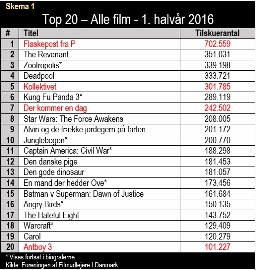 Førstepladsen på den foreløbige top 20 i 2016 sidder Flaskepost fra P tungt på, og der har været pæne resultater på både Kollektivet og Der kommer en dag. De tre film kan dog ikke alene redde dansk film.