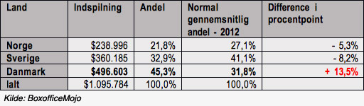 I Danmark blev der i 2012 udsendt ikke mindre end 156 ikke-skandinaviske spillefilm, og Danmark var først på pletten 70 gange, Sverige 50 gange og Norge 33 gange – og tre gange var der uafgjort. Selv hvis man fratrækker de film, som ikke blev udsendt i Sverige og Norge, er resultatet stadig, at Danmark er hurtigst på aftrækkeren på flest film.