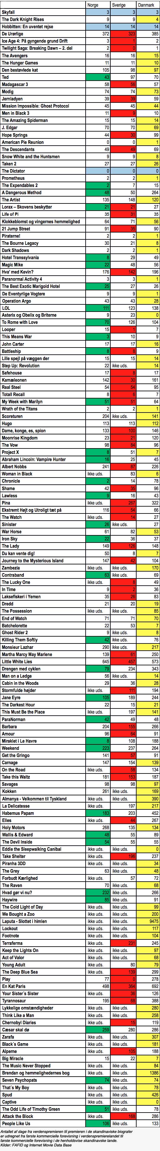Nedenstående skema dækker samtlige ikke-skandinaviske film, udsendt i Danmark i 2012 med angivelse af antal dage mellem verdenspremiere og premiere i Norge, Sverige og Danmark.