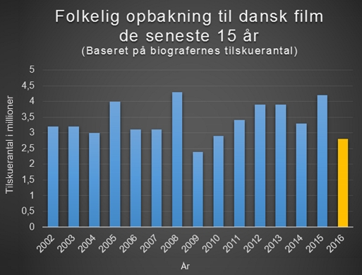 Tilbage står, at dansk film i 2016 kun en enkelt gang de seneste femten år har oplevet mindre folkelig opbakning (se skemaet, hvor tilskuerantallet er i millioner).