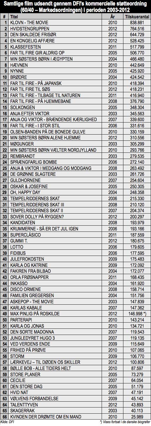 Ved gennemgang af samtlige film Det Danske Filminstitut har støttet gennem den kommercielle støtteordning i perioden 2003-2012 – altså de seneste ti år - vil man opdage fem spændende detaljer:
