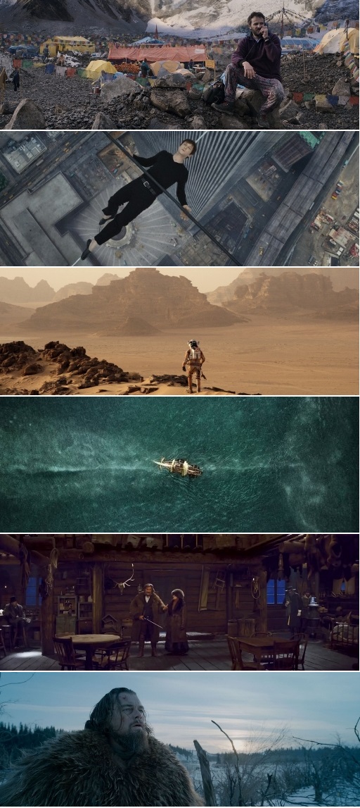 Nedenstående fotos fra Everest, The Walk, The Martian, I havets hjerte, The Hateful Eight og The Revenant viser de store, visuelle visioner. Afslutningsvis bringer jeg klip fra de seks film: